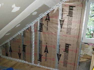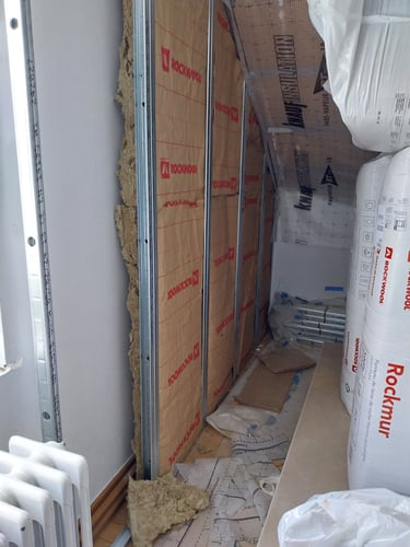 - Les murs de l'étage donnant sur l'extérieur sont isolés par l’intérieur en laine de roche de 14 cm,