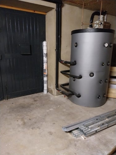 - Le chauffage ainsi que l’eau sanitaire sont alimentés par une chaudière à granulé (en remplacement de la chaudière fuel), deux panneaux solaires thermiques et un poêle à bois labellisé flamme verte (le bois de la cheminée est fourni par l’entretien de notre propriété ou des bois alentours),
